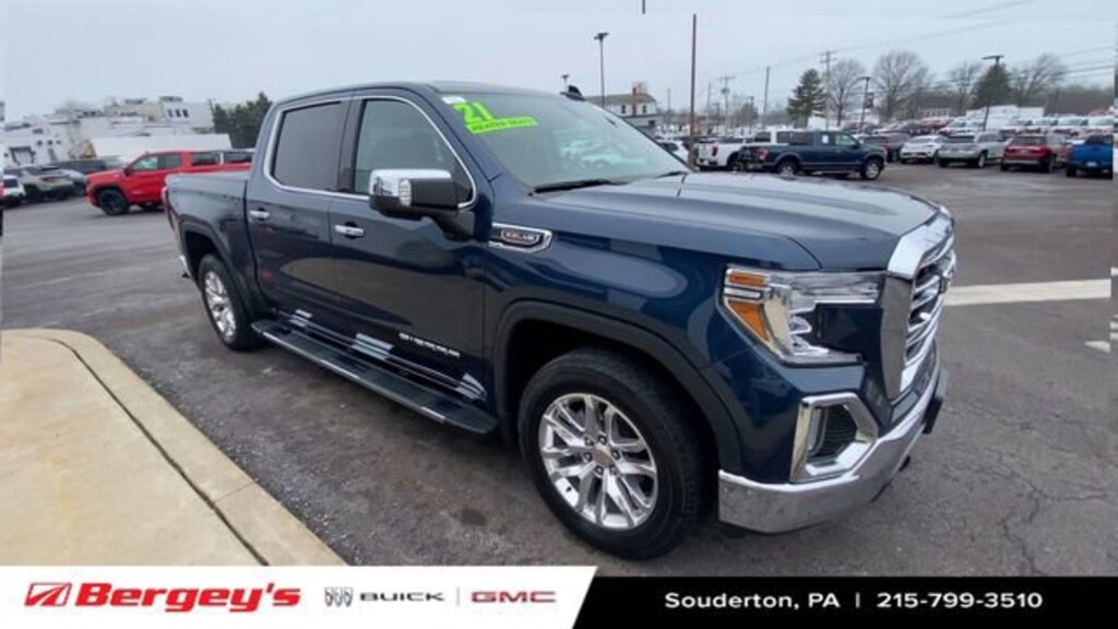 Certified Vehicle!This 2021 GMC Sierra 1500 SLT is a remarkable pickup that offers exceptional capability, comfort, and style. Let's explore its standout features:- **CLEAN CARFAX**- **ONE OWNER**- CERTIFIED- 6.2L V8 EcoTec3 engine with Dynamic Fuel Management- Cat-Back Performance Exhaust- 20 Polished Aluminum Wheels- Tri-Fold Hard Tonneau Cover- MultiPro Audio System by Kicker- Chrome Wheel-to-Wheel Assist Steps- Performance Air Intake SystemThis Sierra SLT is more than just a capable workhorse; it's a premium-appointed truck that delivers an exceptional driving experience. The powerful 6.2L V8 engine, paired with a smooth-shifting 10-speed automatic transmission, provides ample power and towing capacity, while the advanced Dynamic Fuel Management system optimizes efficiency.The exterior of this Sierra boasts a striking Blue Metallic paint finish, complemented by chrome accents and the bold, muscular styling that defines the GMC brand. The Tri-Fold Hard Tonneau Cover and spray-on bedliner add both functionality and a touch of refinement to the truck bed.Inside, the Sierra SLT pampers you with a wealth of comfort and convenience features. The heated and power-adjustable front seats, dual-zone automatic climate control, and premium Kicker audio system create a truly luxurious driving environment. The advanced infotainment system with Apple CarPlay and Android Auto integration keeps you connected and entertained on the go.Certified Vehicle! This Sierra 1500 SLT has undergone a rigorous inspection and reconditioning process, ensuring it meets the highest standards of quality and reliability. With the peace of mind of a Certified Pre-Owned warranty, you can drive with confidence, knowing this truck has been thoroughly vetted and is ready to provide years of dependable service.This exceptional 2021 GMC Sierra 1500 SLT is a must-see for any discerning truck buyer. Its impressive capabilities, premium features, and certified status make it a compelling choice. We invite you to experience the power and refinement of this remarkable vehicle firsthand. Contact us today to schedule a test drive and discover why the Sierra SLT should be your next trusted companion on the road.