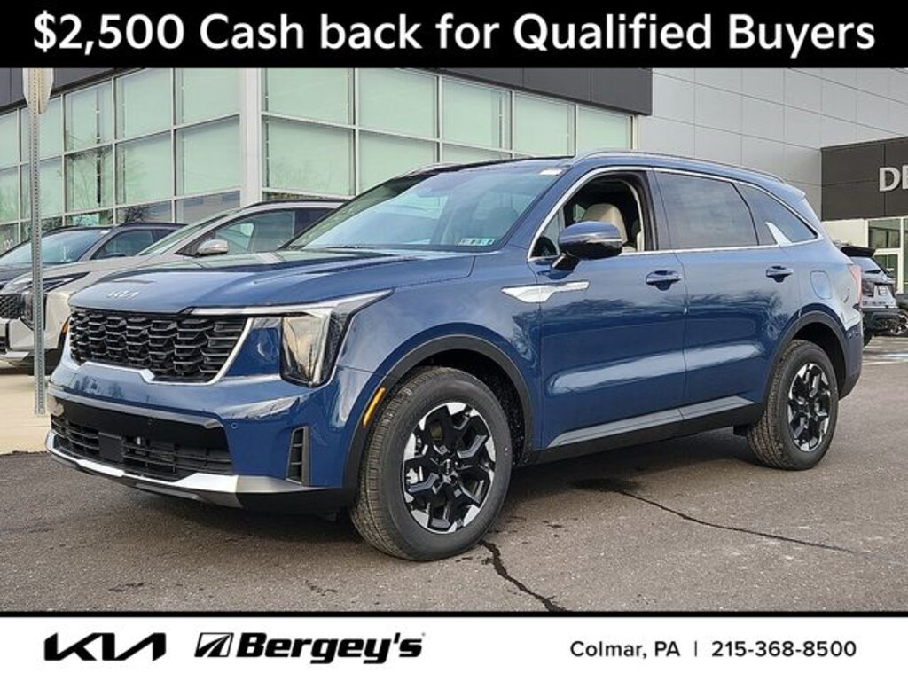 Midnight Lake Blue 2026 Kia Sorento S AWD 8-Speed Automatic 2.5L I4 DGI DOHC 16V LEV3-SULEV30 191hp AWD. 23/28 City/Highway MPG