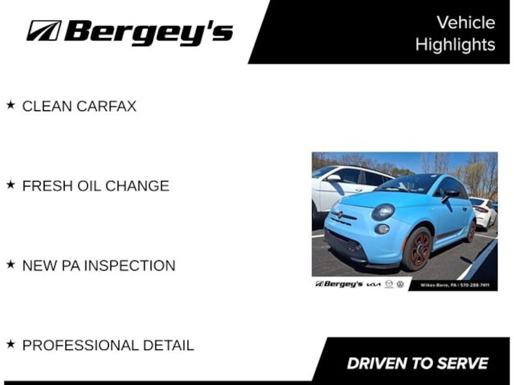 Celeste Blu (Retro Light Blue) 2016 Fiat 500e Battery Electric FWD Single Speed Electric Motor CLEAN CARFAX, FRESH OIL CHANGE, NEW PA INSPECTION, PROFESSIONAL DETAIL.