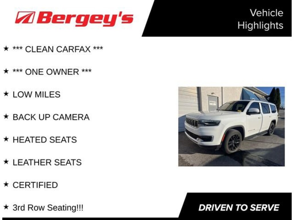 Recent Arrival! *** CLEAN CARFAX ***, *** ONE OWNER ***, LOW MILES, BACK UP CAMERA, HEATED SEATS, LEATHER SEATS, CERTIFIED, 3rd Row Seating!!!. Certified. Certification Program Details: *6-Month/6,000-Mile Bumper-to-Bumper Limited Warranty*, whichever comes first, in addition to any remaining original factory Bumper-to-Bumper warranty. See participating dealer and warranty booklet for limited warranty eligibility and coverage details, including limitations and exclusions. *Except for non-GM vehicles in the State of California, where coverage will be provided by a vehicle service contract. Priced below KBB Fair Purchase Price!2022 Bright White Clearcoat Jeep Wagoneer 4WD 5.7L V8 8-Speed Automatic