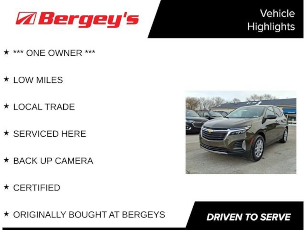 *** ONE OWNER ***, LOW MILES, LOCAL TRADE, SERVICED HERE, BACK UP CAMERA, CERTIFIED, ORIGINALLY BOUGHT AT BERGEYS. Certified. Certification Program Details: *6-Month/6,000-Mile Bumper-to-Bumper Limited Warranty*, whichever comes first, in addition to any remaining original factory Bumper-to-Bumper warranty. See participating dealer and warranty booklet for limited warranty eligibility and coverage details, including limitations and exclusions. *Except for non-GM vehicles in the State of California, where coverage will be provided by a vehicle service contract. Priced below KBB Fair Purchase Price! Odometer is 10813 miles below market average!26/31 City/Highway MPG2023 Harvest Bronze Metallic Chevrolet Equinox FWD 1.5L DOHC 6-Speed Automatic Electronic with Overdrive